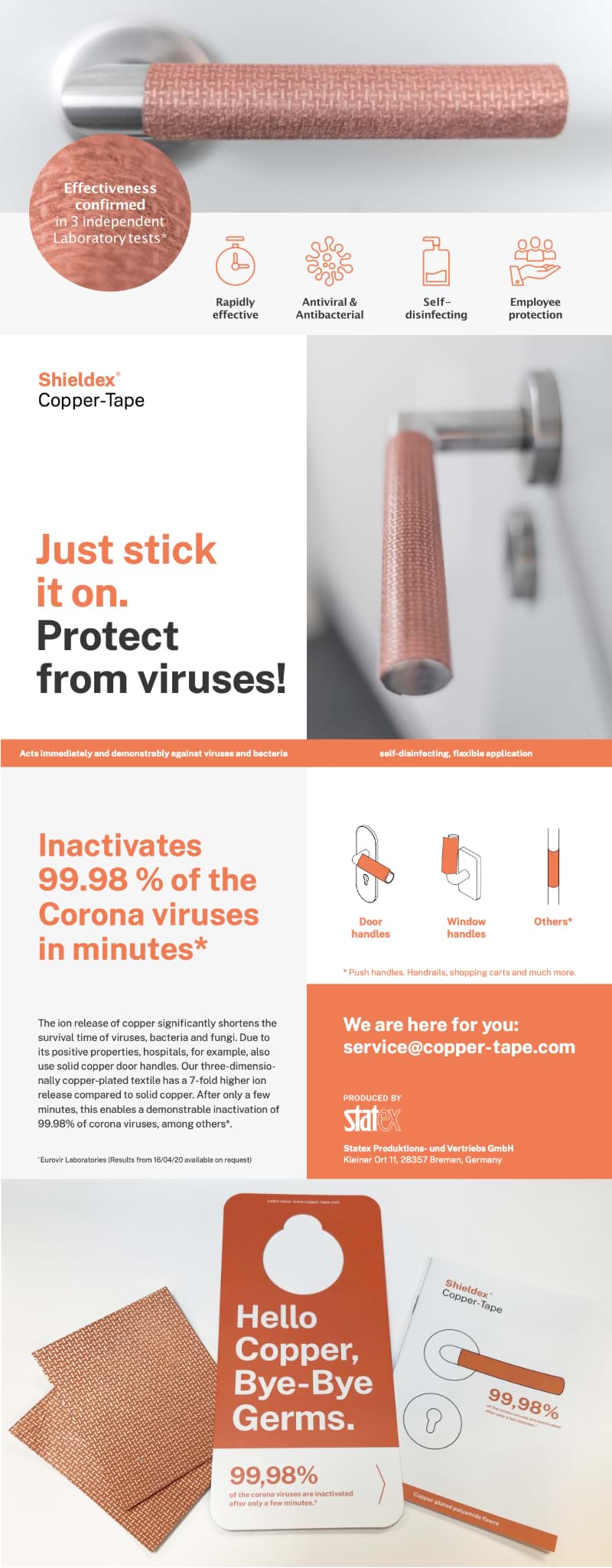 International studies have repeatedly proven that copper has antiviral, antibacterial and fungicidal properties, shortening the half-life of viruses, bacteria and fungi¹. EA study carried out on behalf of the US authorities has shown that copper also inactivates the SARS-CoV-2 virus in a very short time². Because of its positive properties, hospitals use door handles made of solid copper³. The latest laboratory results also independently confirm the effectiveness of Shieldex® Copper-Tape. The Eurovir® hygiene laboratory was able to prove that TGEV corona viruses on the tape are 99.98% inactivated after only 60 minutes⁴. The renowned Hohenstein Institute also confirms the significant viricidal and strong antibacterial effectiveness of our copper textiles⁵.