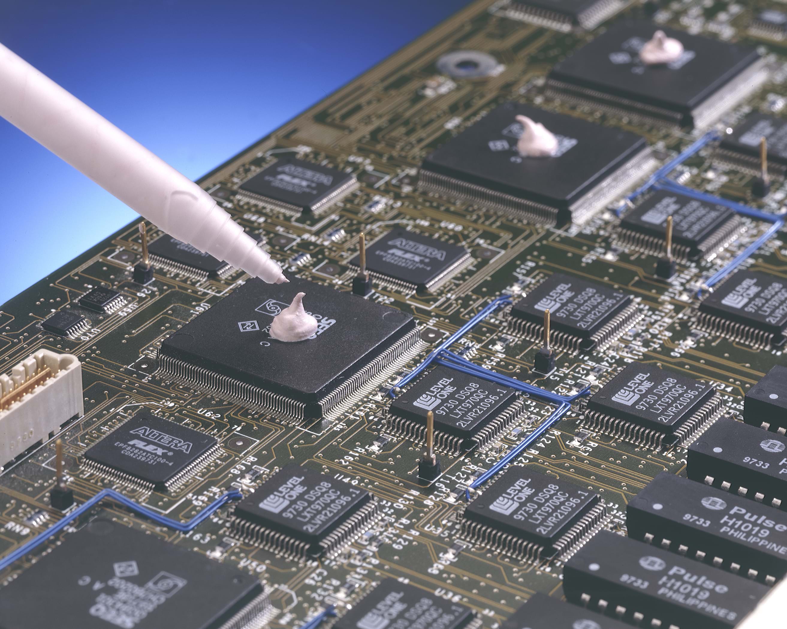 THERM-A-GAP™ Gels are highly conformable, pre-cured, single component compounds. The cross-linked gel structure provides superior long term thermal stability and reliable performance. These unique materials result in much lower mechanical stress on delicate components than even the softest gap-filling sheets. They are ideal for filling variable gaps between multiple components and a common heat sink. They are supplied as pre-cured, single component compounds that can be dispensed over the heat generating component.